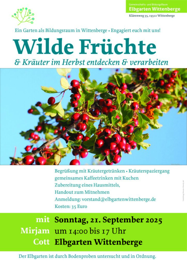Zur Teilnahme ist eine verbindliche Anmeldung unter vorstand@elbgartenwittenberge.de nötig. Bitte überweisen Sie die Teilnahmegebühr in Höhe von 35€ bis bis zum 15. September 2025. Nur wenn sich mindestens acht Teilnehmende finden, können wir den Wildkräuterspaziergang anbieten.