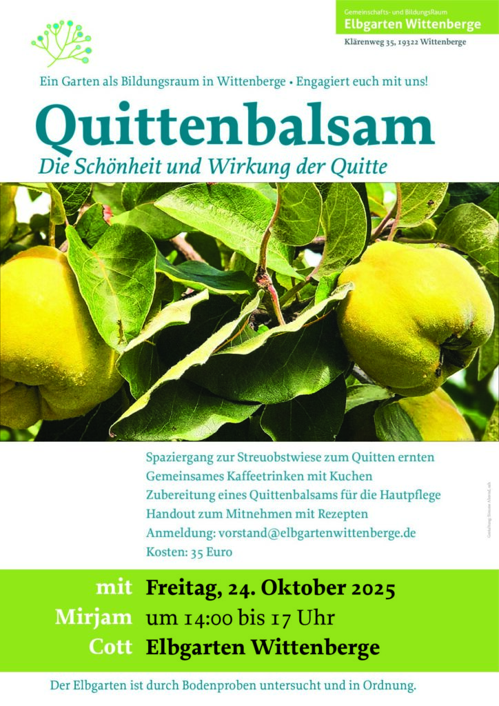 Wittenberge • Der Elbgarten Wittenberge bietet am Freitag, 24. Oktober 2025 von 14 bis ca. 17 Uhr einen Spaziergang der speziellen Form an. Gemeinsam mit der Kräuterfrau Mirjam Cott lernen wir Quitten kennen, sammeln und verarbeiten sie. Der Workshop kostet 35 Euro.